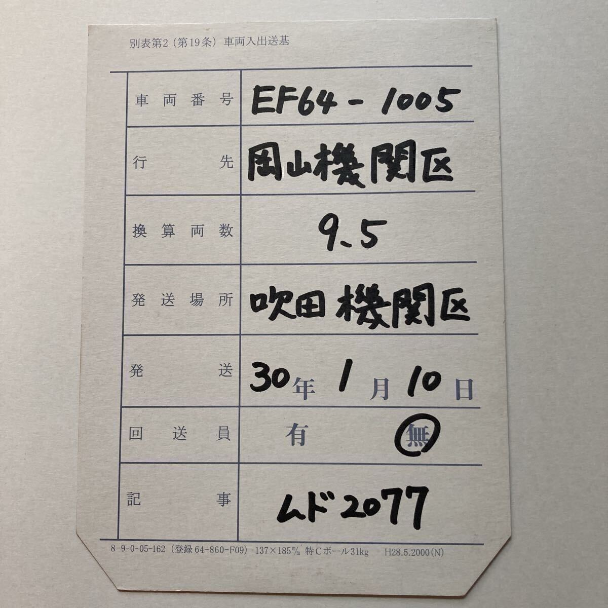 - 【回送車票】EF64ー1005/岡山機関区→吹田機関区◆平成30年1月/ムド2077