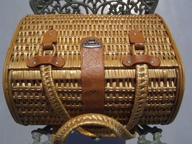 > ●70S 昭和レトロ キャメルレザー×竹編み上げ 可愛い ほのぼの^^。仲良くピクニック バスケット センチメンタルモダン アンティーク 希少