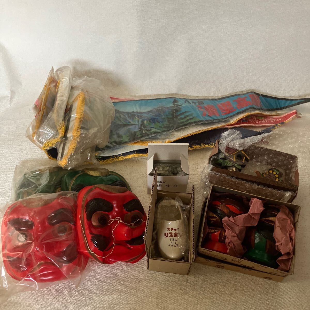 > c1170 80 昭和レトロ お土産 置物 飾り インテリア まとめて 工芸品 爪楊枝立て 天狗お面 ペナント折れシワ有り 汚れ有り 和風 和室 人形