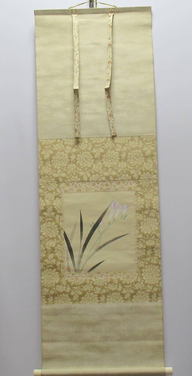 > 真作 古い掛軸『「フリージア」 蓬春 掛軸(121×40㎝)書部分(26,5×24cm)紙本 肉筆』〇門観咸