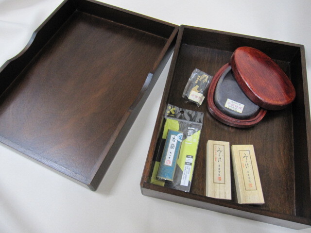 - 書道具 おまとめ■道具箱 すずり石 香蘭 みかさ 1丁型 02003 墨運堂 固形墨 書道 習字 和墨 仮名 文具 硯 中国物産 現状品