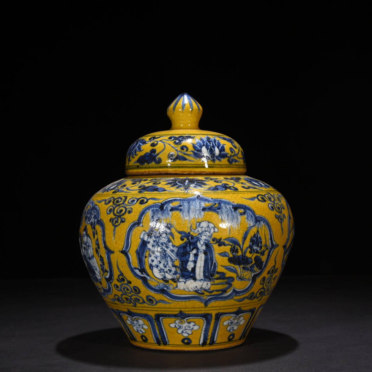 - 元時代 青花 染付 黄地 四愛人物文蓋罐 唐物 箱付き 陶磁器 中国美術 古美術 置物 骨董品 H19