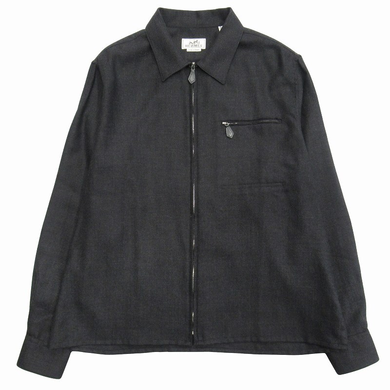 - 美品 エルメス HERMES セリエボタン ウール ジップアップ シャツ ジャケット ブルゾン レザープル 42サイズ 16 1/2 グレー メンズ