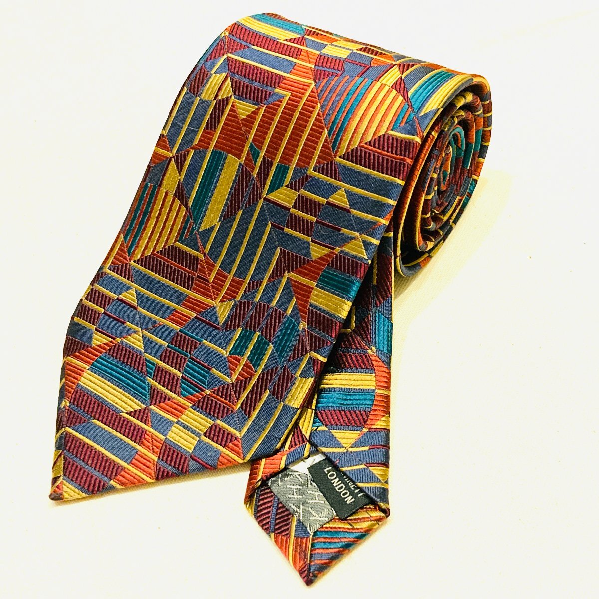 > KATHARINE HAMNETT LONDON キャサリンハムネット 絹 シルク SILK 100% 高級 ネクタイ ボルドー/ブルー系 幾何学模様