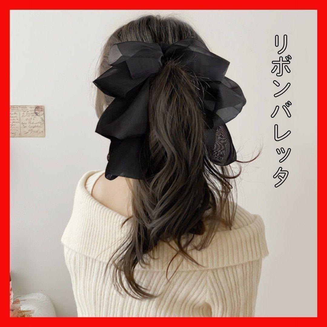 - リボンバレッタ ビッグリボン 韓国 ブラック 黒 ヘアアクセサリー シフォン