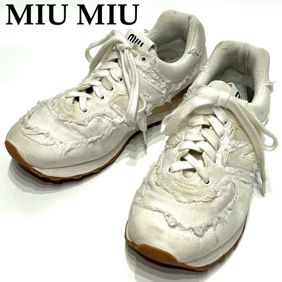 - Miu Miu ミュウミュウ 25.5cm ニューバランス コラボ ダメージ加工 デニム スニーカー ホワイト 白色 メンズ 靴 シューズ