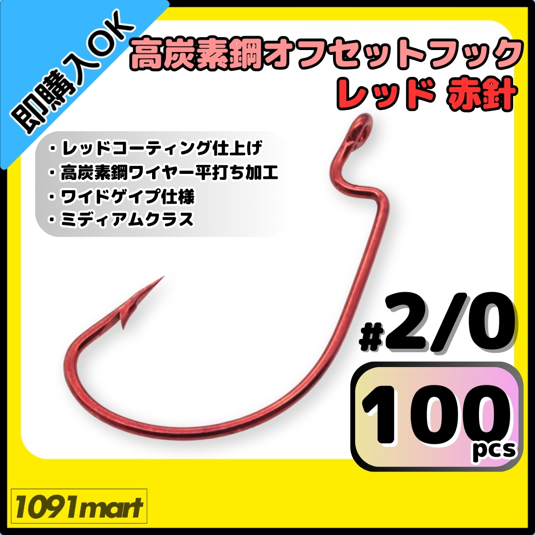 - 【送料無料】高炭素鋼 オフセットフック レッド赤針 #2/0 100本セット レッドコーティング仕上げ ワームフック テキサスリグ等様々なリグに