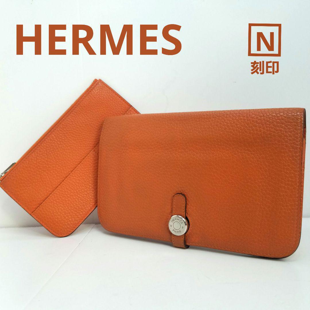 > 送料無料 HERMES エルメス 41NM □N刻印あり ドゴン GM シルバー金具 オレンジ系 折り財布 古銭入れ有り トゴ レザー 革 フランス製