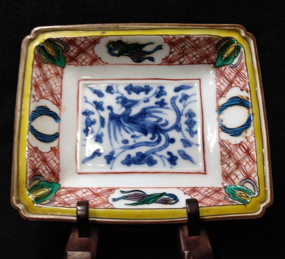 > 九谷焼 染付 色絵 花唐草文 角福 隅切 鳳凰図 16cm 長皿 江戸期 b-57a4593-cee
