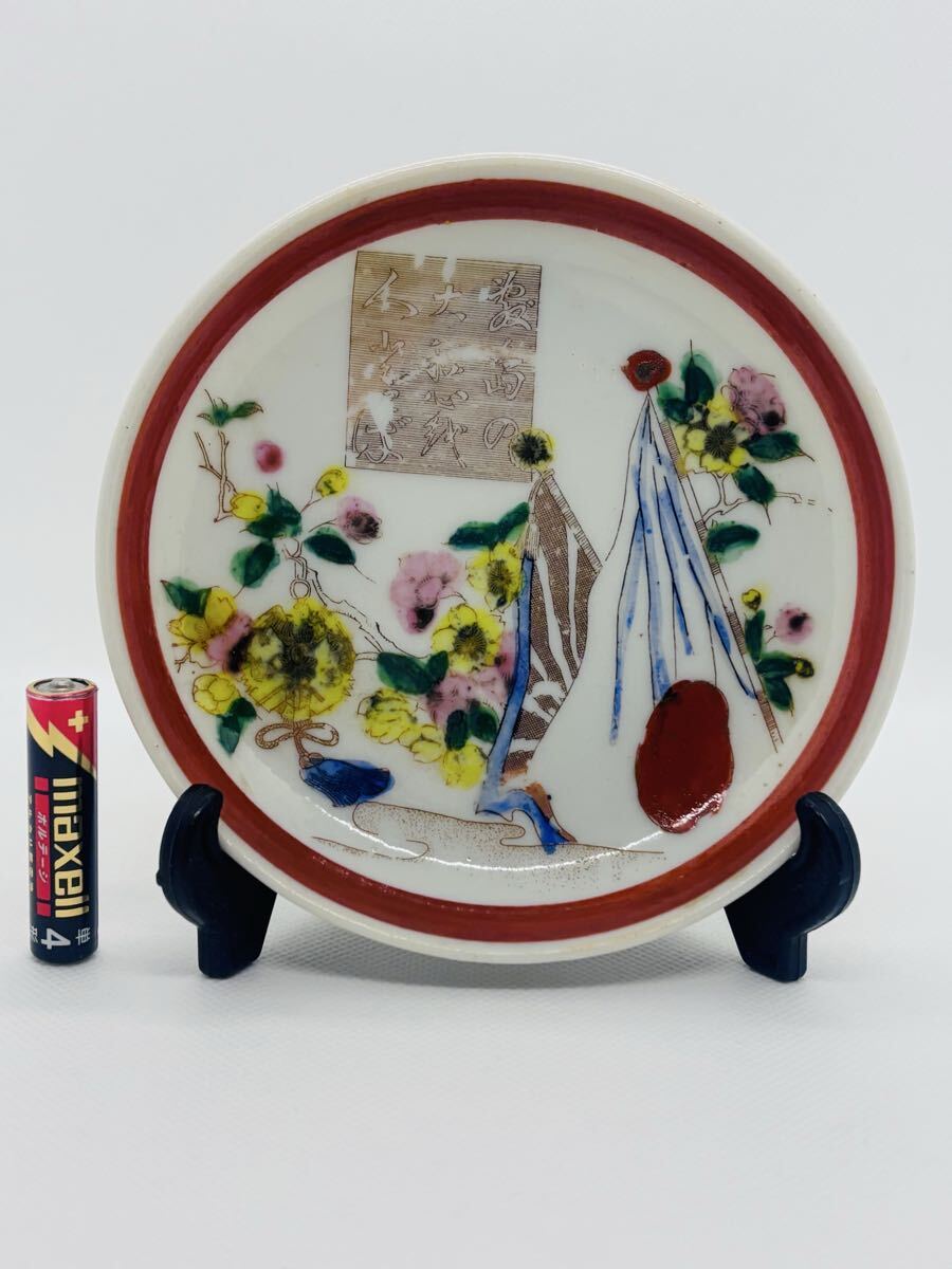 - 明治期 図変わり印判 色絵皿 「 敷島の大和心を〜 本居宣長 日の丸 軍旗 金鵄章 桜紋 」径 約12.5㎝