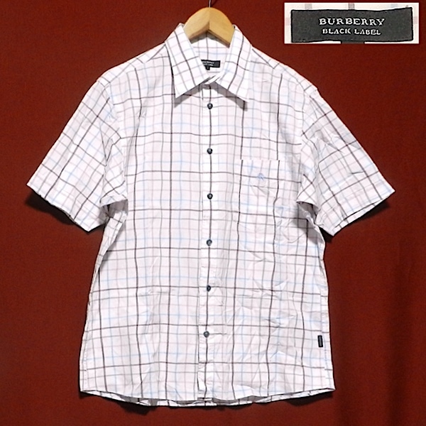- BURBERRY バーバリー ブラックレーベル ロゴ 刺繍 rogo 半袖シャツ ドレスシャツ デザインシャツ 薄い ピンク 水色 チェック柄 3 / L 美品