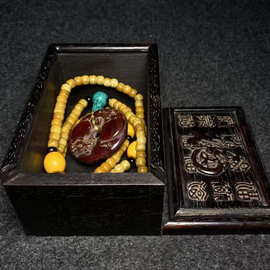 > 清時代 花梨木寶盒珍藏 佛珠項 搭配牛角平安扣吊墜 箱有 極細工 古置物 古美術 古賞物 古董品 時代物 旧家蔵出 中国唐物928