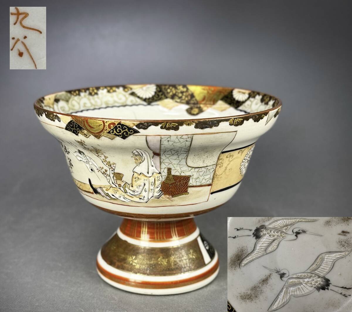 - 【偲】九谷焼 金彩 色絵 菓子鉢 人物 鶴 口径13.5cm 高さ10.5cm 骨董品 酒器 陶磁器 在銘 b-25