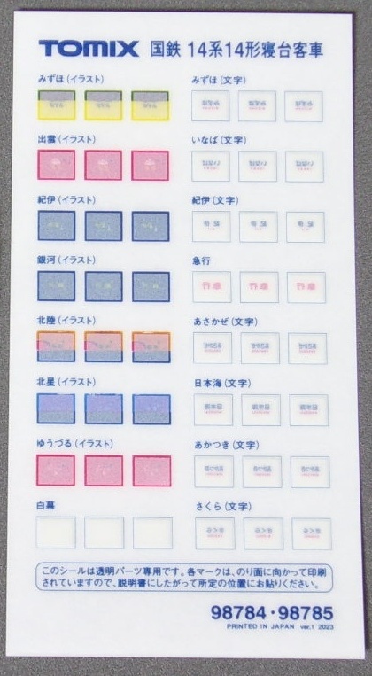 > TOMIX スハネフ14用 トレインマークシール [98784/98785 14系14形 さくら 基本/増結セットより] みずほ 出雲 紀伊 銀河 北陸 北星 ゆうづる