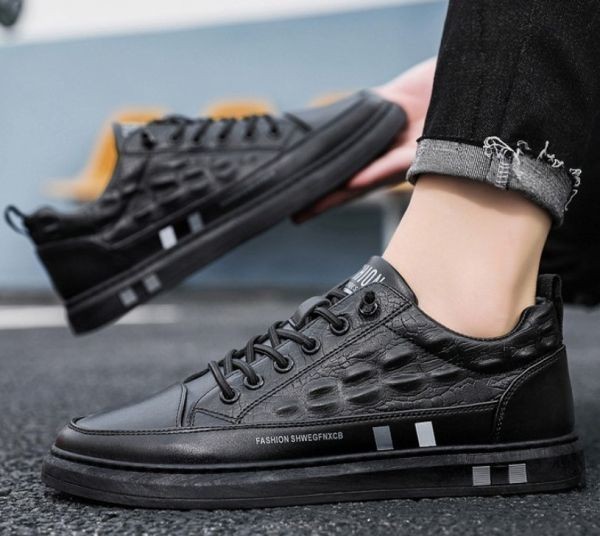 - 靴 【26cm】【 s33 】黒 メンズ ローカット PUレザー スニーカー クロコダイル風 クロコ 型押し シューズ スポーツ カジュアル シンプル