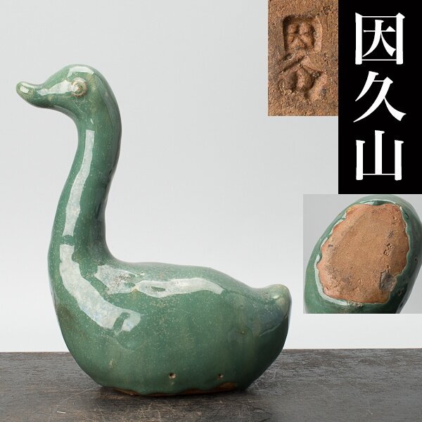 > 【千h0745】因久山 緑釉 鳥 置物 高さ約20.5cm 箱無 因久山焼 鳥取 御用窯
