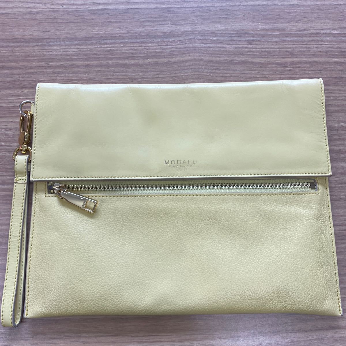 - 【中古保管品】MODALU モダルー クラッチバッグ レザー ストラップ付き イエロー 黄色 貝殻柄