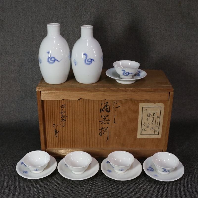 - ★昭和16年 森野嘉光 染付巳ノ絵酒器揃 共箱 徳利一対 酒盃5客★