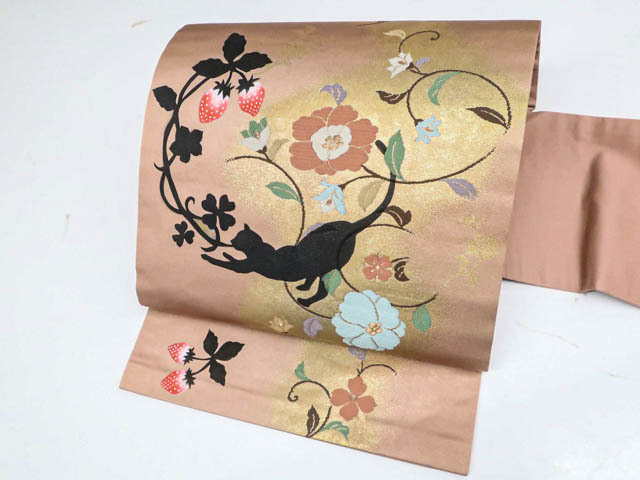 - 《古美術京松》リサイクル着物 オリジナル 九寸名古屋帯 お太鼓柄 猫 苺 金糸 正絹 r7b09-146