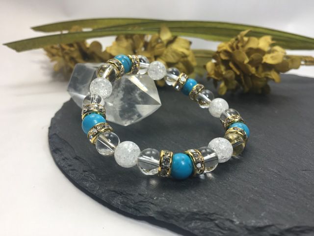 > ターコイズ&水晶&クラック水晶 パワーストーン ブレスレット 天然石ブレス (ゴールド) 幸運 開運 4月 誕生石 クリスタル レディース