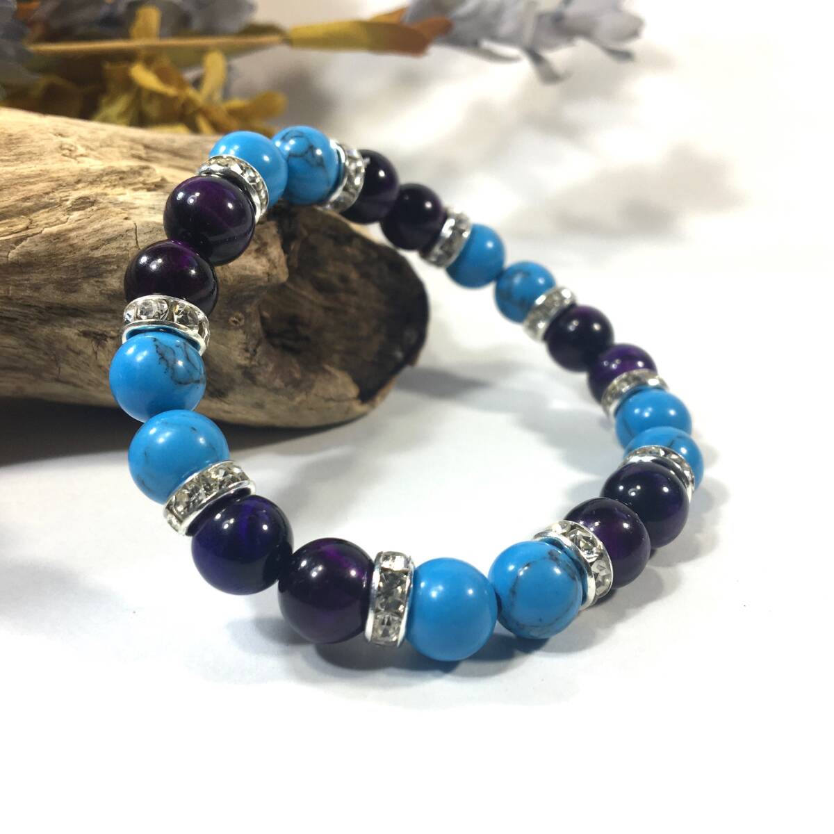 - ターコイズ&パープルタイガーアイ パワーストーン ブレスレット シルバー 8mm /開運 浄化 魔除け お守り 成功 繁栄 効果 レディース 通販