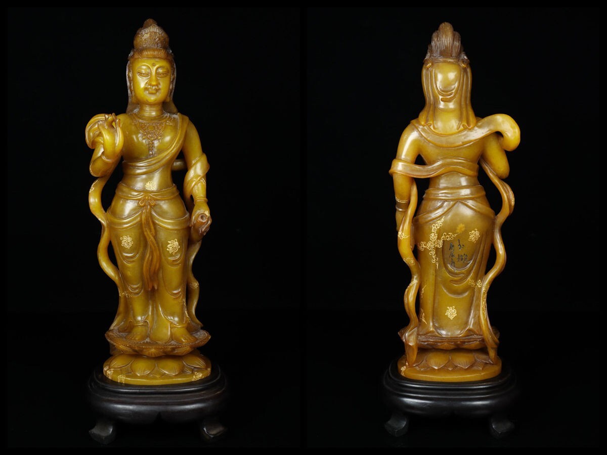 - 「清 玉セン 老寿山石 田黄石彫り 観音擺件」極細工 擺件 古賞物 中国古美術 旧蔵出