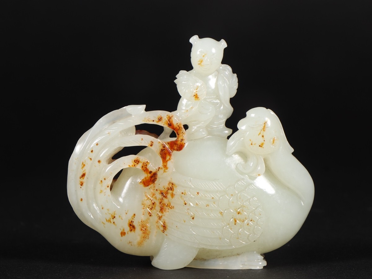 - 「清時代 和田玉 子料彫り 童子鳳鳥 擺件」極細工 擺件 中国古賞物 古美術 旧蔵出
