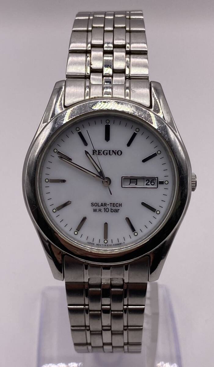 > 稼動品『13137』 REGUNO SOLAR TECH レグノ ソーラーテック E101-K005299 メンズ腕時計 ソーラー デイデイト 稼働品 文字盤ホワイト