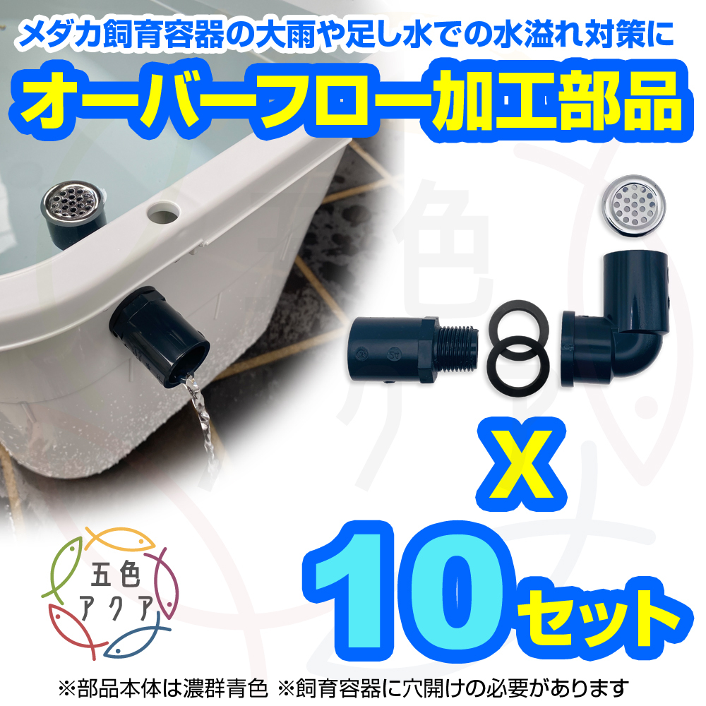 - 【新タイプ】オーバーフロー部品10セット(キャップ付) メダカ飼育容器の大雨対策 メダカ飼育ケース 金魚飼育容器【五色アクア】09'