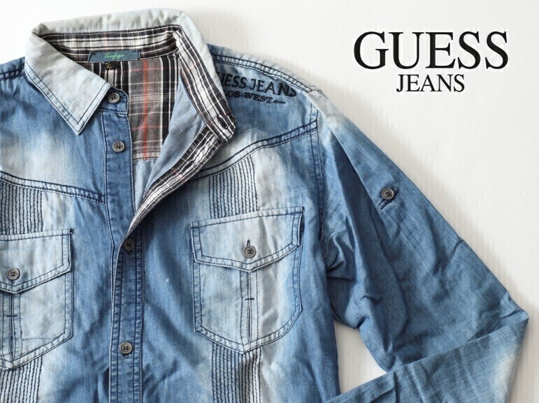 > ★中古品★LUO GAO SHI × GUESS JEANS ゲスジーンズ★ダメージ加工両ポケット付き長袖デニムシャツXL★ウォッシュドブルー紺【本物保証】