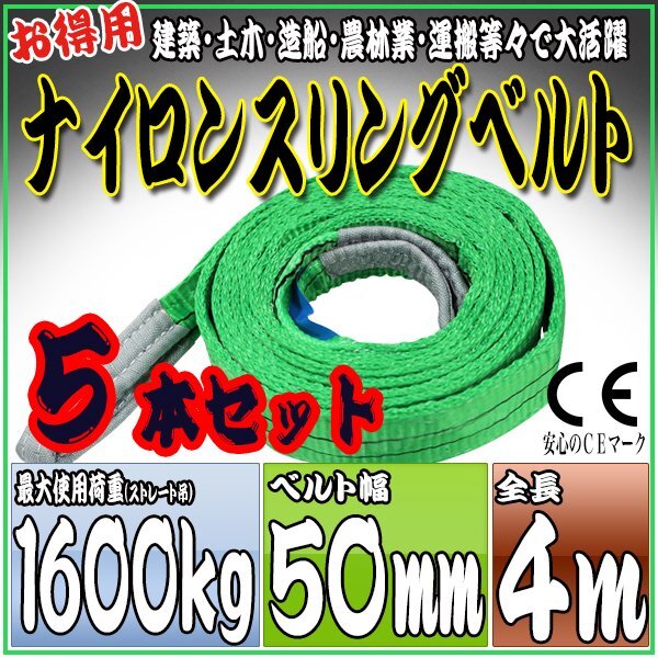 > スリングベルト 5本セット 4m 幅50mm 使用荷重1600kg 1.6t 吊りベルト ベルトスリング [ナイロンスリング 吊上げ ロープ 牽引 運搬]