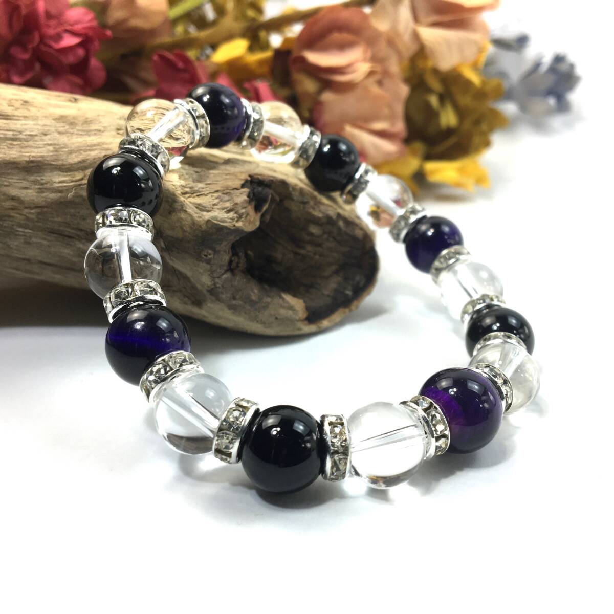- パープルタイガーアイ×水晶×オニキス パワーストーン ブレスレット 天然石ブレス (ロンデル: シルバー) 10mm メンズ・レディース