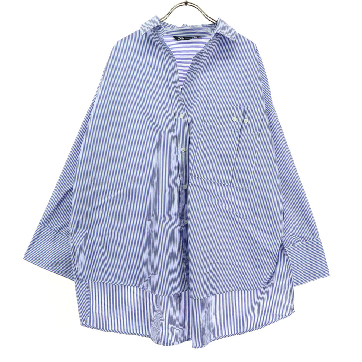 美品 ZARA ザラ 細ストライプ柄 長袖 ビッグサイズ スキッパー シャツ S ブルー系 レディース