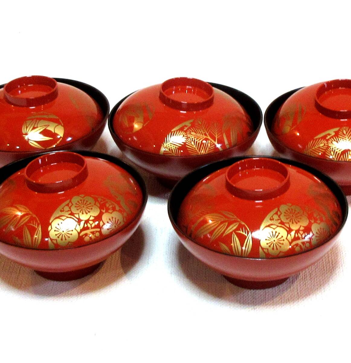 - ★おもてなしに♪★会津塗 吸い物椀 5客セット 朱 花丸蒔絵 ★送料無料
