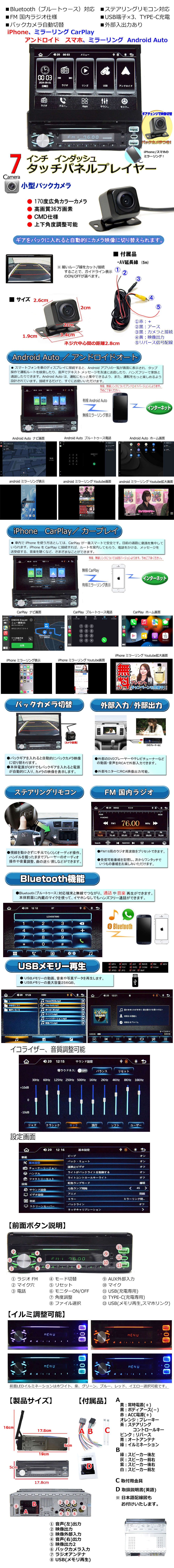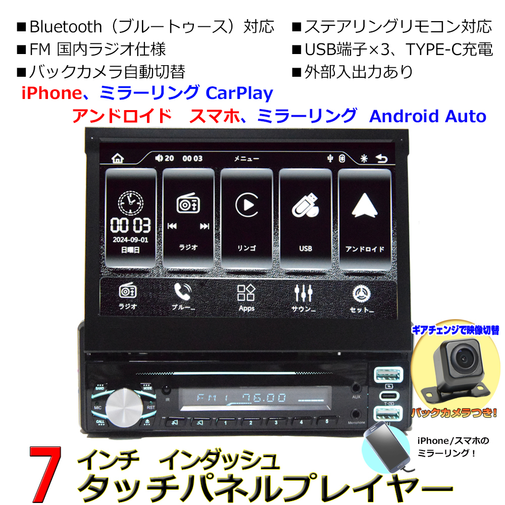 - 車載 1DIN 7インチインダッシュプレーヤー+170度バックカメラセット CarPlay ミラリング Android Auto iPhone 無線接続【一年保証】