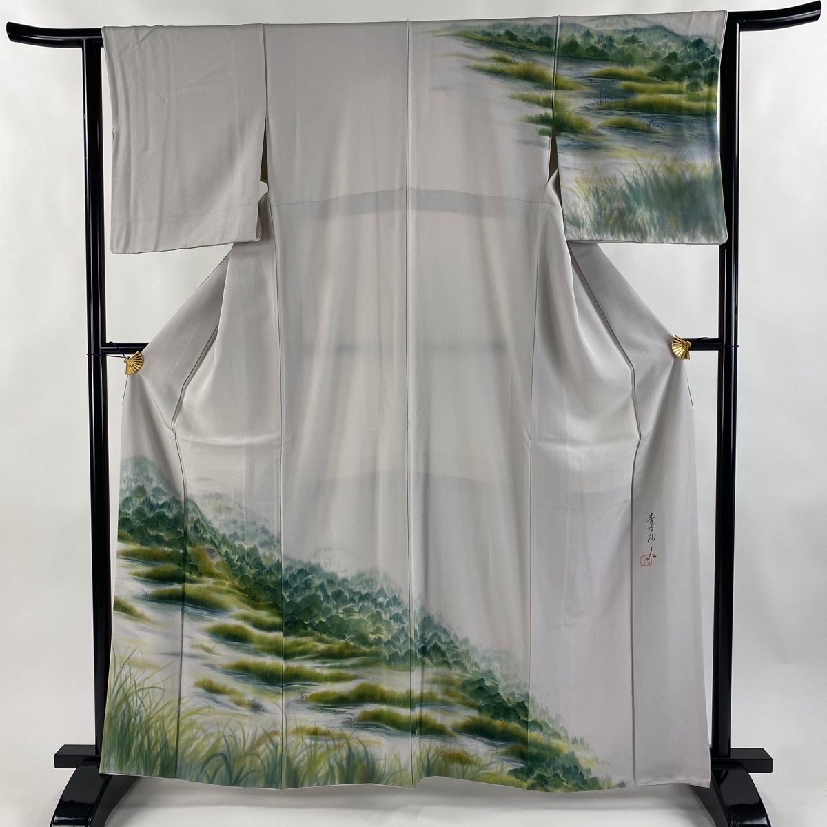 - 訪問着 身丈161.5cm 裄丈63.5cm S 袷 鈴乃屋 落款 風景 家屋 ぼかし 灰色 正絹 秀品 【中古】
