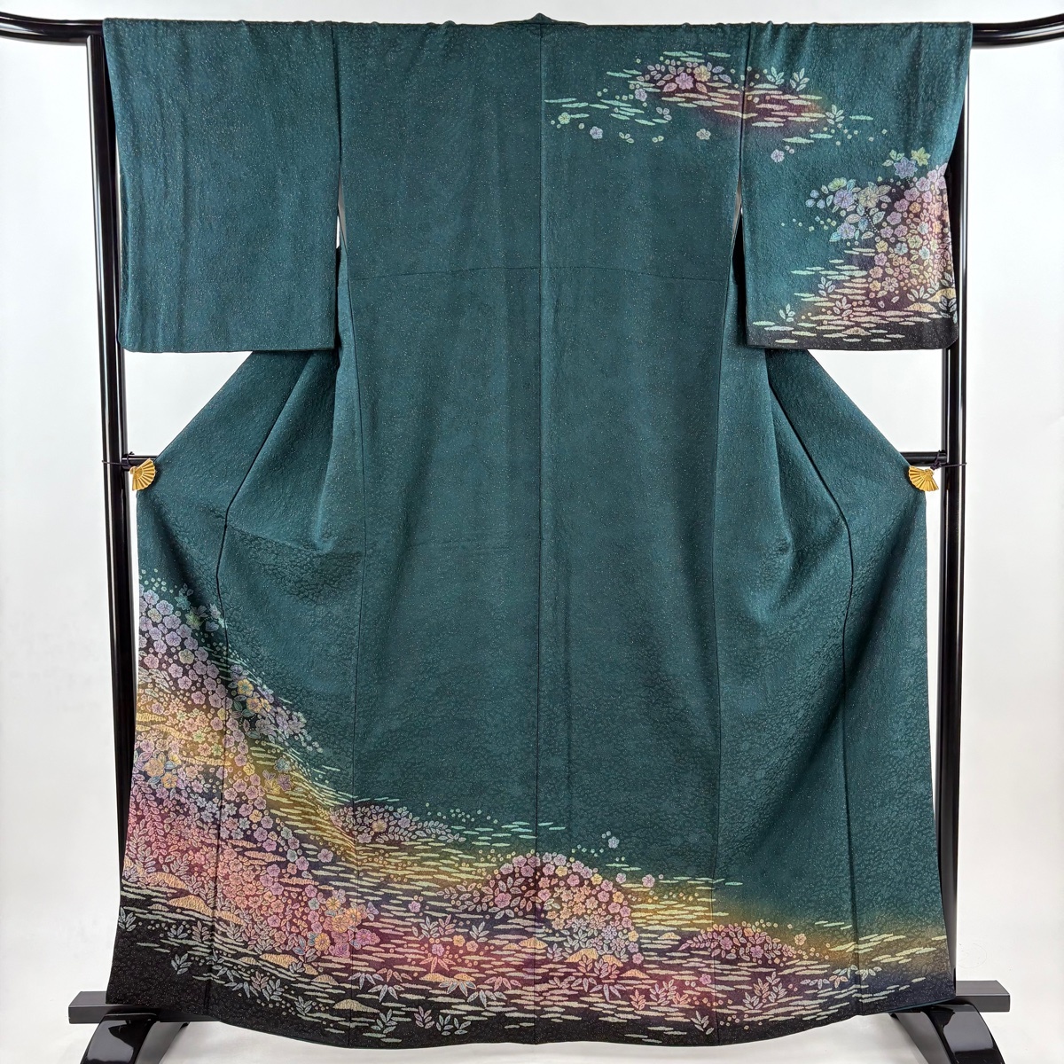 - 訪問着 身丈163cm 裄丈65.5cm M 袷 草花 楓 金通し 絞り 深緑 正絹 名品 【中古】