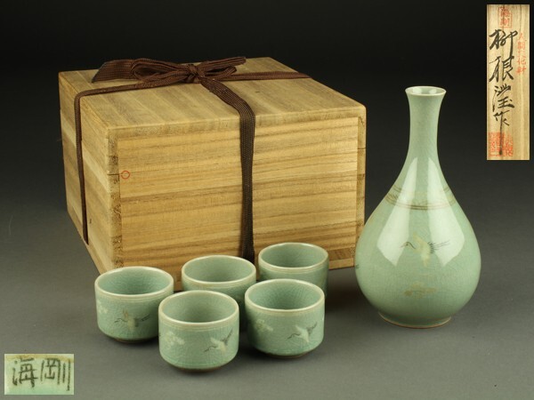 - 【宇】1327 韓国人間文化財 柳海剛造 青磁 雲鶴象嵌酒器 共箱