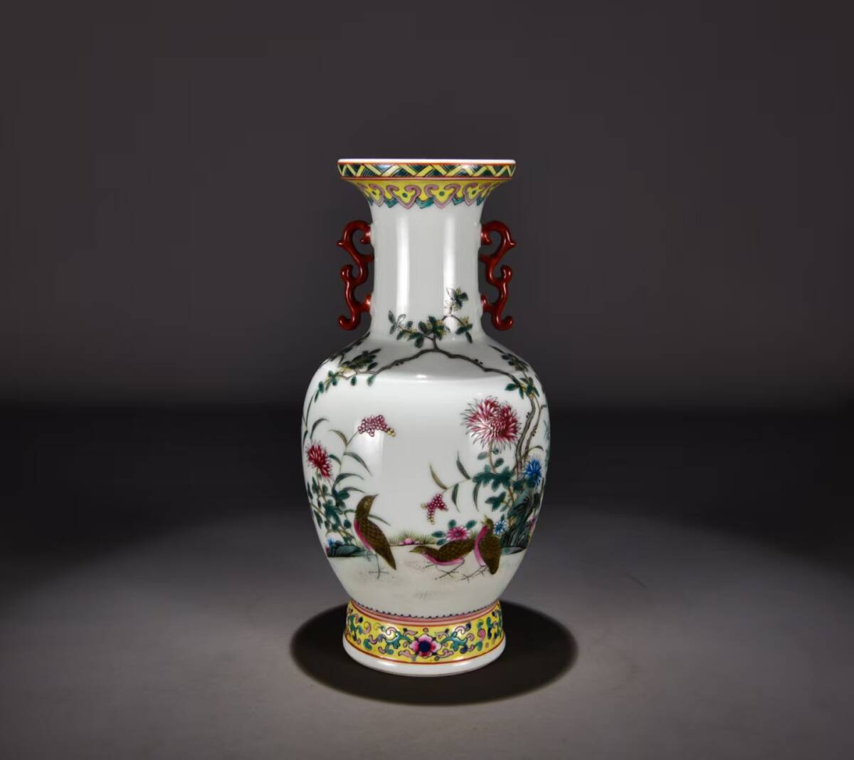 - 磁器 旧蔵 大清乾隆年製 粉彩 花鳥紋 雙耳瓶 古陶瓷 古擺件 古置物 中国古玩 骨董品 時代物 稀少唐物