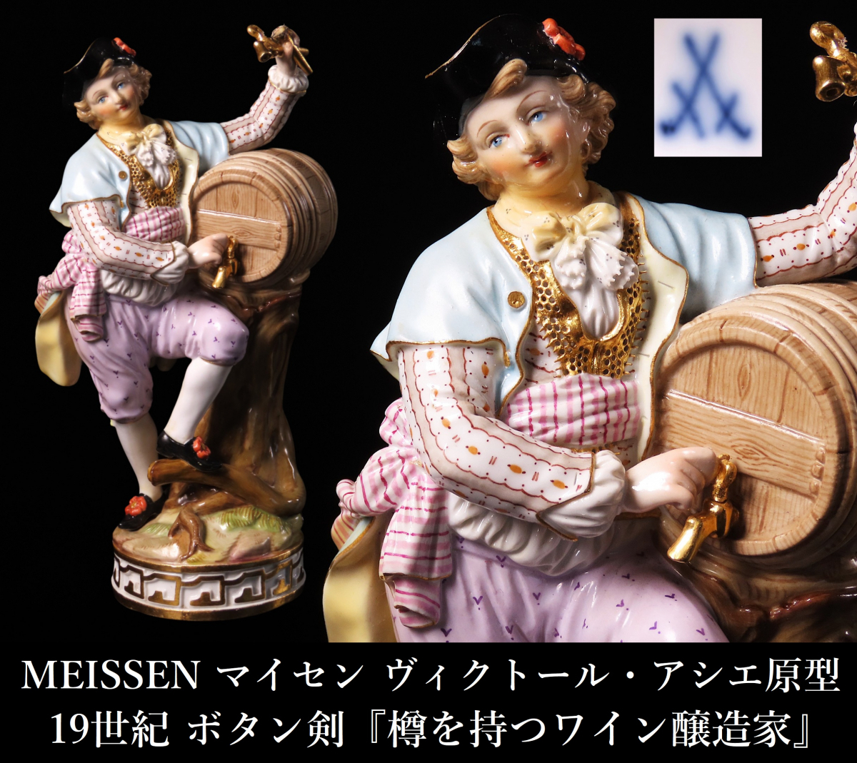 > 【晃】MEISSEN オールドマイセン 19世紀 ボタン剣 主任成形師アシエ原型 『樽を持つワイン醸造家』 フィギュリン 高17.1cm 西洋美術