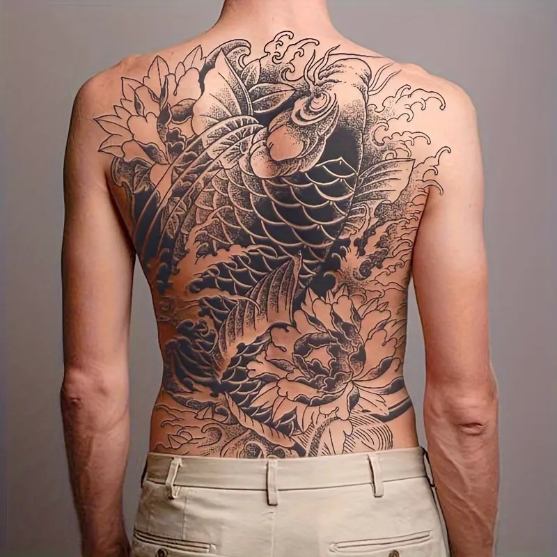 - タトゥーシール 鯉 刺青シール 和柄 フェイクタトゥー 34cm×48cm 背中 フルバック リアル和彫 防水・耐久性あり! (Hm003)