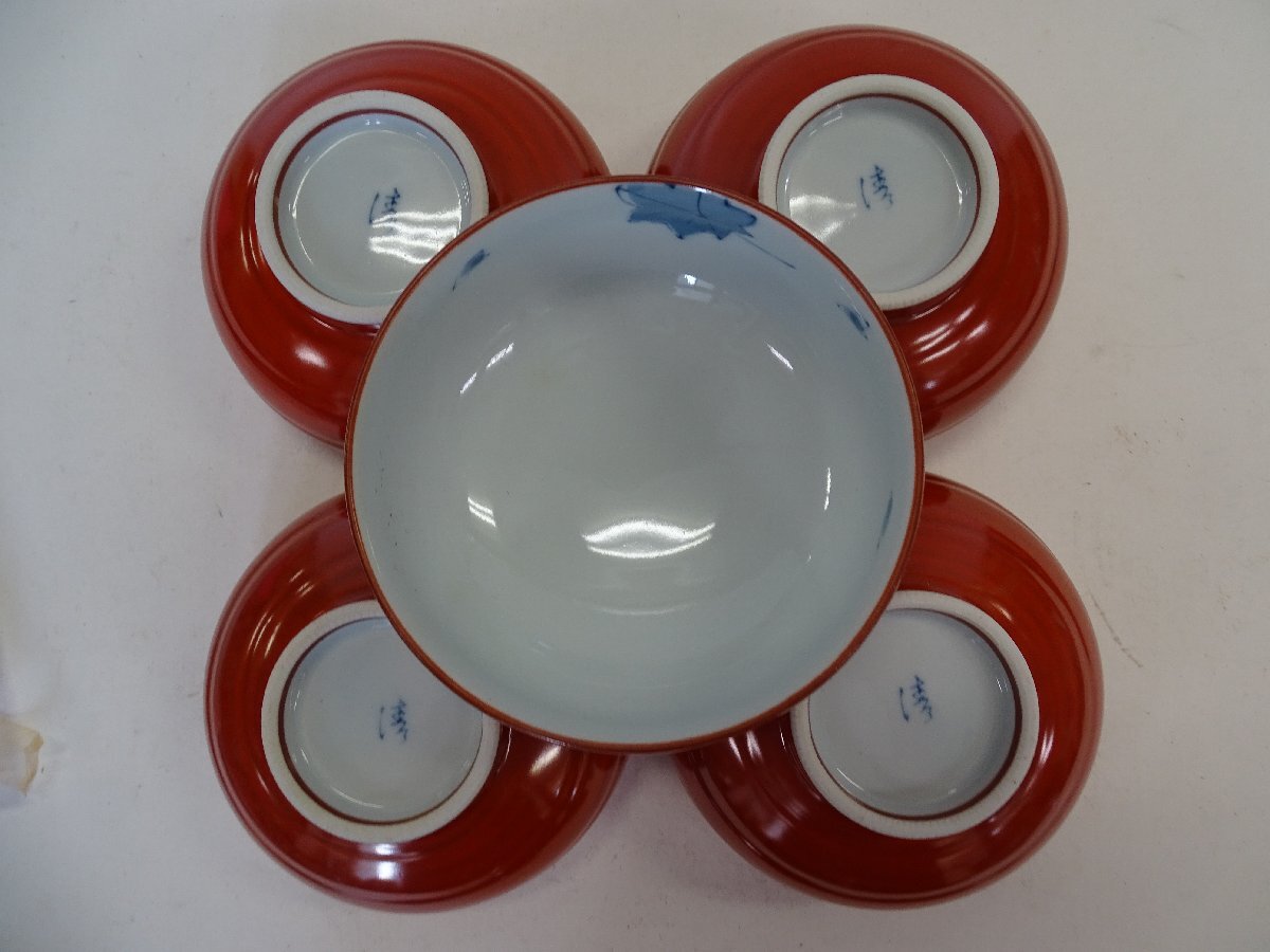 - ・品名:有田焼(五個セツト)・作者:清作品・技法:朱巻紅葉陶器・NO-R6-10-2.8
