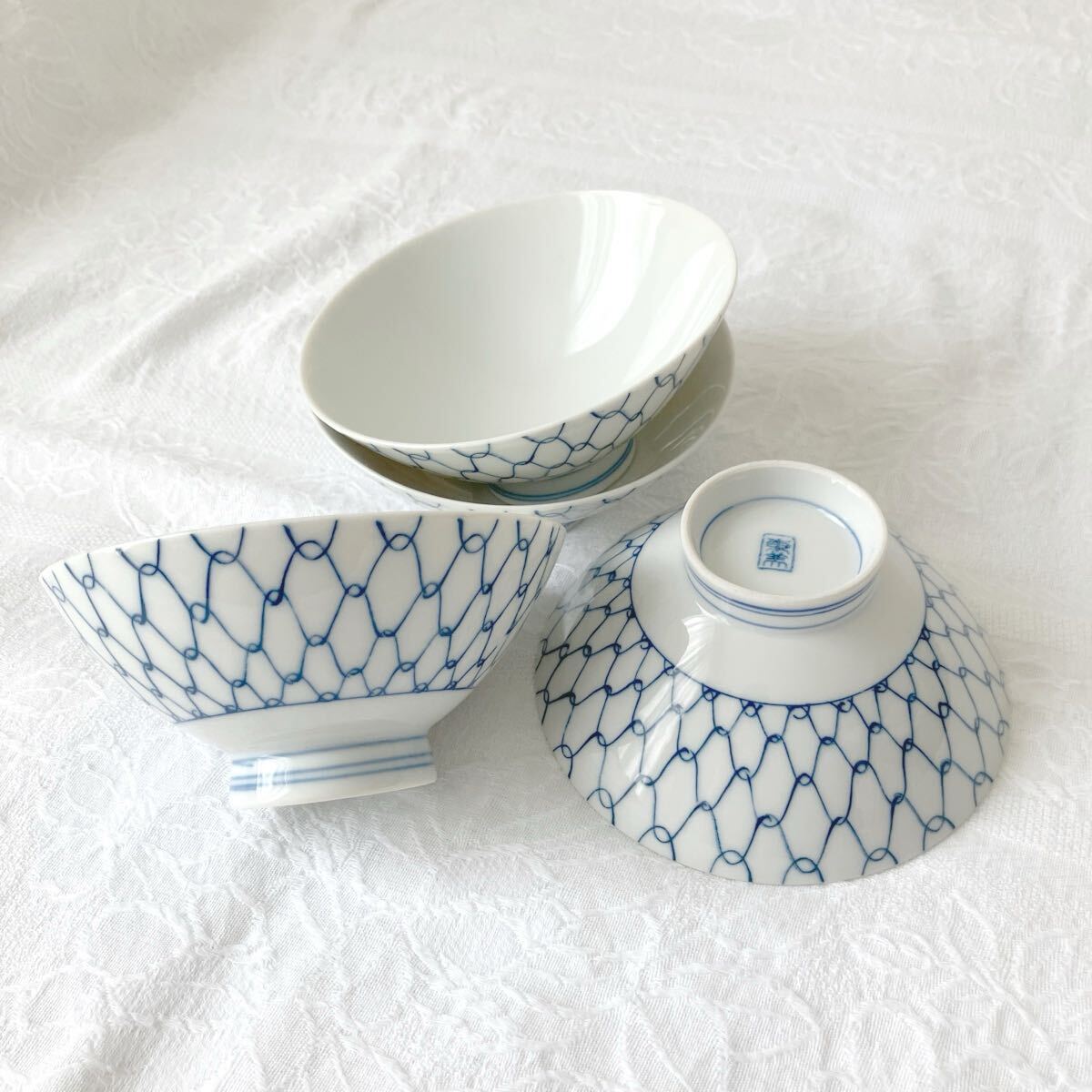 - m32)東美 飯碗 染付 網目 4客セット ご飯 茶碗 昭和 レトロ ビンテージ 食器 ヴィンテージ 皿