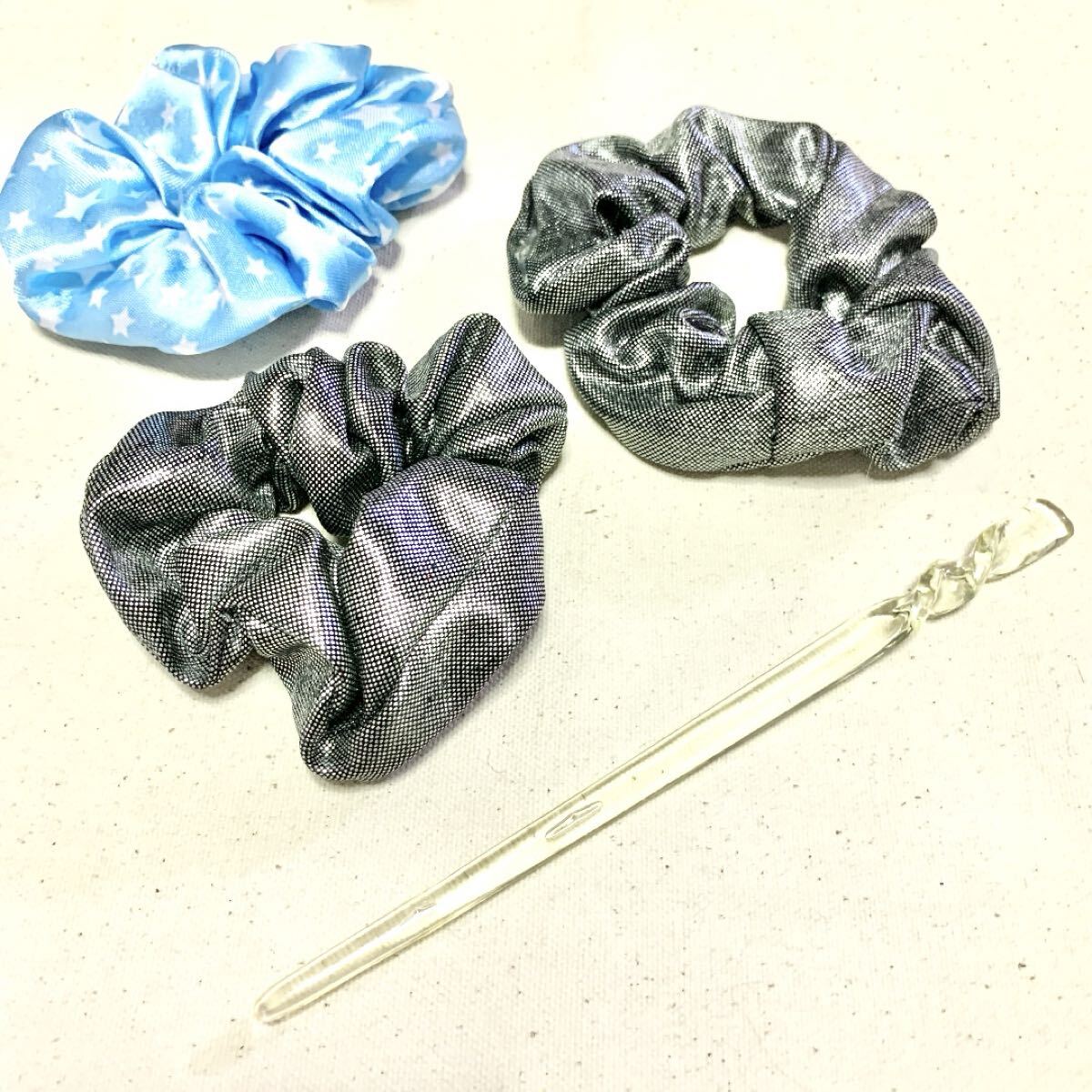 - 新品未使用 髪飾り4点セット かんざし シュシュ クリアヘアスティック ヘアアクセサリー メタリックブラック 水色 星