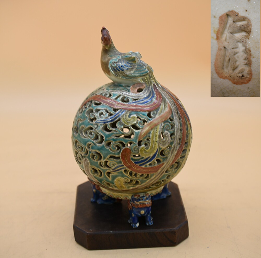 - WY10-2 仁清 刻印あり 彩色鳳凰 玉香炉 三足香炉 獅子足 香爐 鳳凰 獅子 台座付き 色絵 古陶磁 古美術 陶芸品 香道具 長期保管 現状品