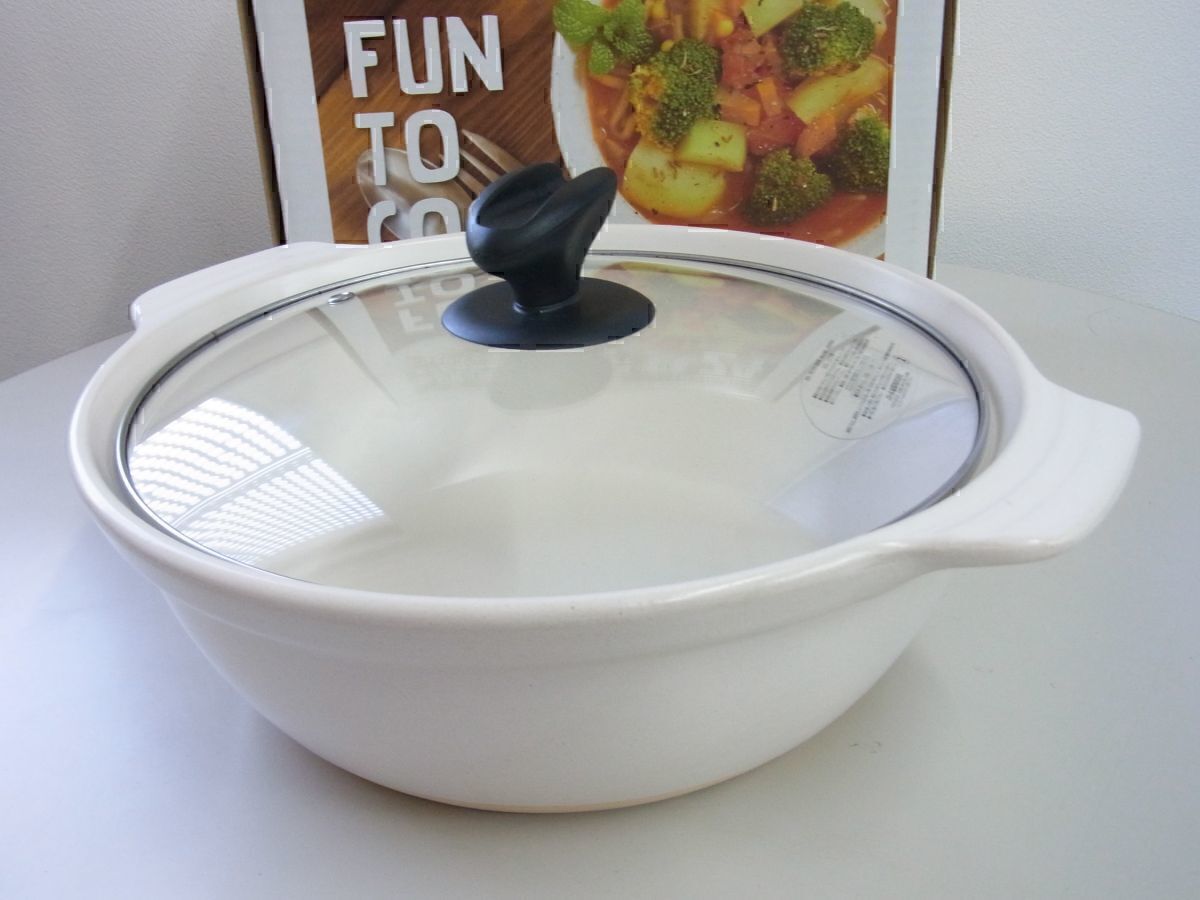 > ★美品PEARL METAL パール金属★ファントゥクック 陶器製ガラス蓋付卓上鍋★24cm両手鍋【L-1887】ホワイト白★ガス火専用★さえ箸お玉置き