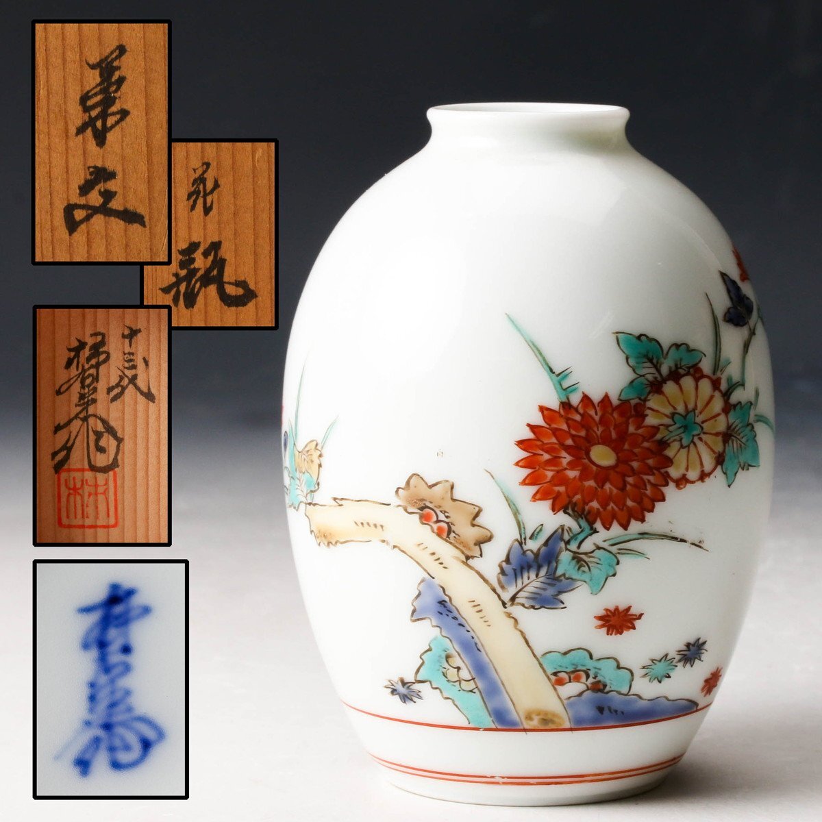 【佳香】十三代 酒井田柿右衛門 錦菊文花瓶 共箱 栞 本物保証拍卖