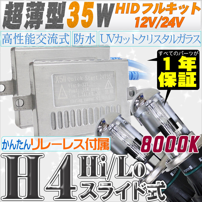 - 高性能 薄型HIDキット 35W H4 Hi/Lo スライド式 リレーレス付 8000K 12V/24V 【交流式バラスト&クリスタルガラスバーナー】