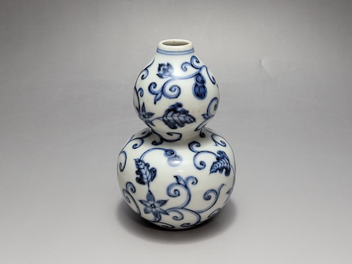 > 染付 瓢箪型 瓶「大明宣徳年製」銘 時代唐物 高さ約12.8cm / 宋元時代 花瓶 飾瓶 花插 花器 唐物 人間国宝 李朝 高麗 古玩 古董