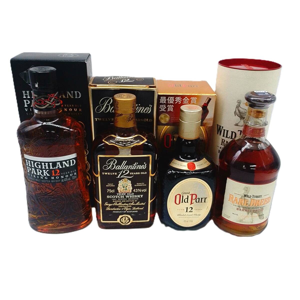 > 未開封 箱付きウイスキー4本 ハイランドパーク12年、バランタイン12年ベリーオールド、オールドパー12年、ワイルドターキーレアブリード
